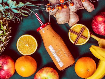 rakytník, zázvor, med, skořice, banán, ananas, jablečný a pomerančový fresh