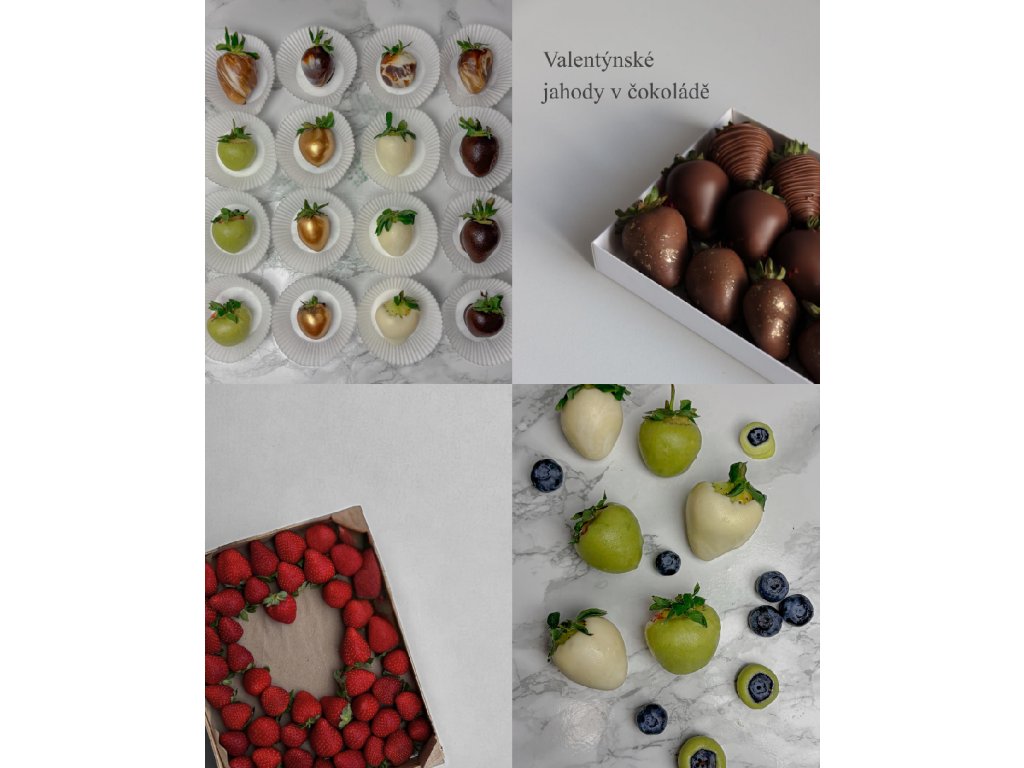 Jahody máčené v tmavé (55 % kakaa) a bílé čokoládě, jahody s mramorovým a zlatým vzhledem.